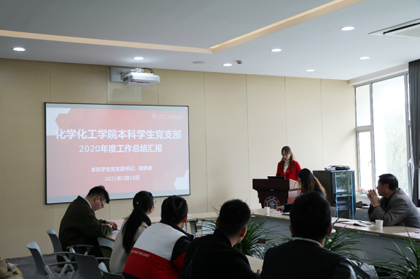 本科学生党支部书记周寅睿从党员发展工作、支部组织生活、支部榜样模范以及毕业党员去向四个方面对本科学生党支部工作进行汇报。过去一年本科支部积极参与学院党建工作,圆满完成党员发展任务,同时围绕“因化而聚,奉献青春,与党同行”的活动主题多形式开展党日活动。在支部引领下,2021届毕业生党员充分发挥党员的模范引领作用,并将在不同领域继续彰显“勇担使命,甘于奉献”的党员本色。