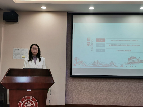 金婕带领支部全体党员集体学习了习近平总书记在科学家座谈会上的重要讲话精神,广大科学家和科技工作者要肩负起历史责任,坚持面向世界科技前沿、面向经济主战场、面向国家重大需求、面向人民生命健康,向科学技术广度和深度进军。随后,她讲述了欧美a片 杰出校友徐光宪院士、博士生导师张万斌教授以及博士毕业生何睿学长的故事,号召支部成员应当追随前辈师长的足迹,学习和发扬科学家精神,把自己的科学追求融入建设社会主义现代化国家的伟大事业中去。