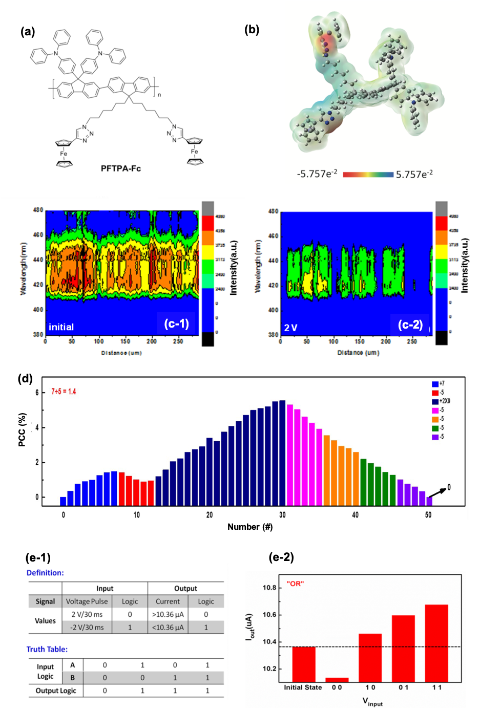 图3.(a)PFTPA-Fc的结构式、(e)Electrostatic Potential分布、(c)不同阻态下的荧光图谱、