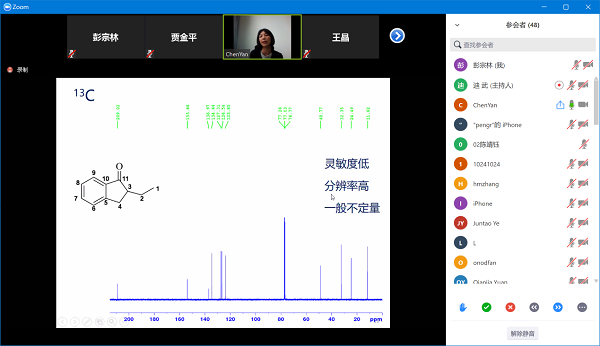 陈燕老师从核磁共振技术(NMR)概述,欧美a片 分析测试中心NMR测试简介和液体NMR实验技术及应用三方面展开介绍。在讲解中,陈燕老师从核磁共振的原理讲起,内容涉及欧美a片 核磁共振仪的性能介绍,谱图的解谱方法,实验技术和适用范围,重点介绍了核磁分析技术在学院近期发表的高水平论文中的应用案例。学院测试平台提供学生自主操作培训教学,可随时预约满足科研需求。讲解的最后,陈燕老师还简要介绍了电子顺磁共振技术(EPR)的特点和应用技术,并比较了EPR和NMR的区别。