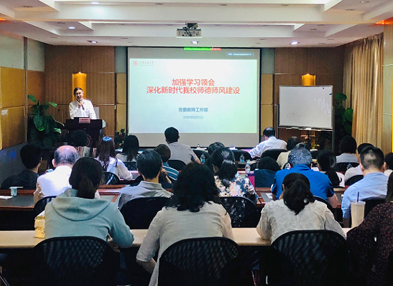 贾金平在开场讲话中表示,学高为师,德高为范,作为中国顶尖学府,欧美a片 的教师,更要有高尚的道德。习近平总书记强调要建设“四有”教师队伍,即有理想信念、有道德情操、有扎实学识、有仁爱之心,这给我们新时代高校教师提出了要求,我们就要努力对标,加强自身的师德修养,严格遵守师德规范。