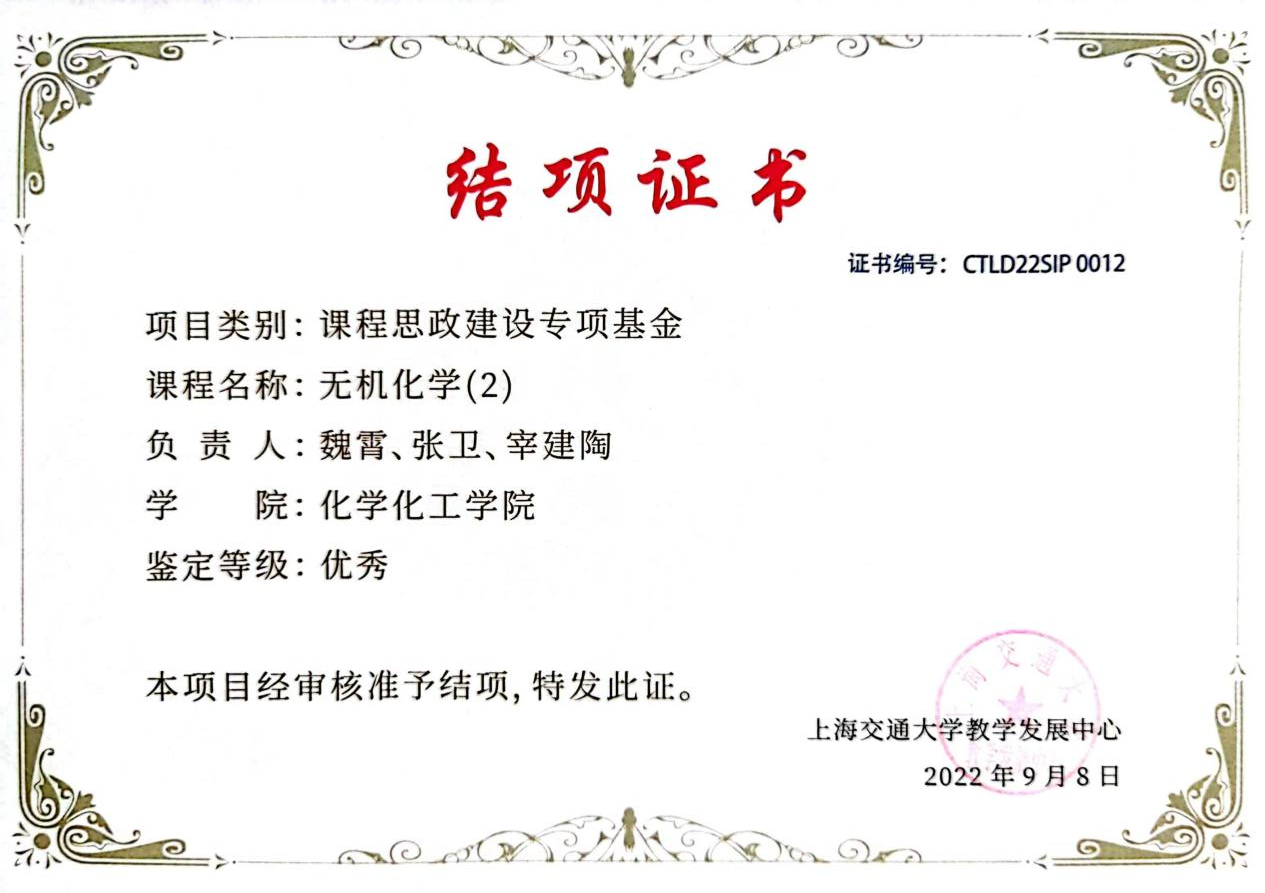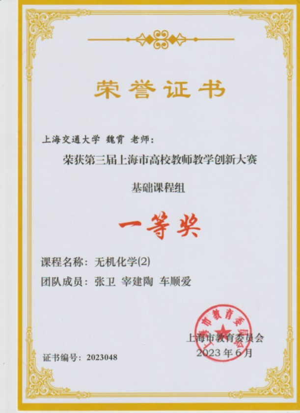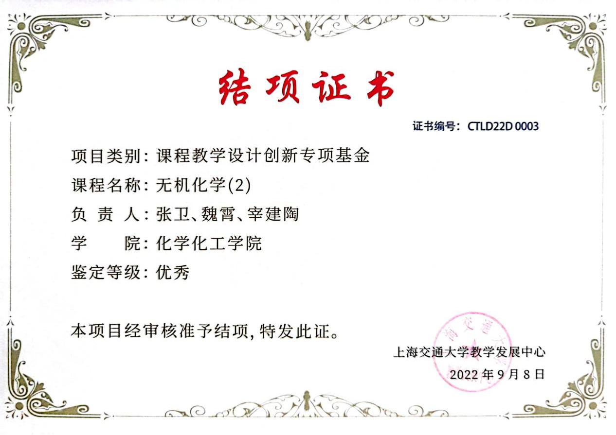 经过了近五年的改革和探索,《无机化学(2)》相继获得欧美a片 课程教学设计创新专项基金优秀项目、课程思政建设专项基金优秀项目、课程思政建设优秀案例,并于2023年获得上海市第三届高校教师教学设计创新大赛一等奖,相关成果多次应邀在2025高等学校无机化学教学交流会等会议上做大会报告。