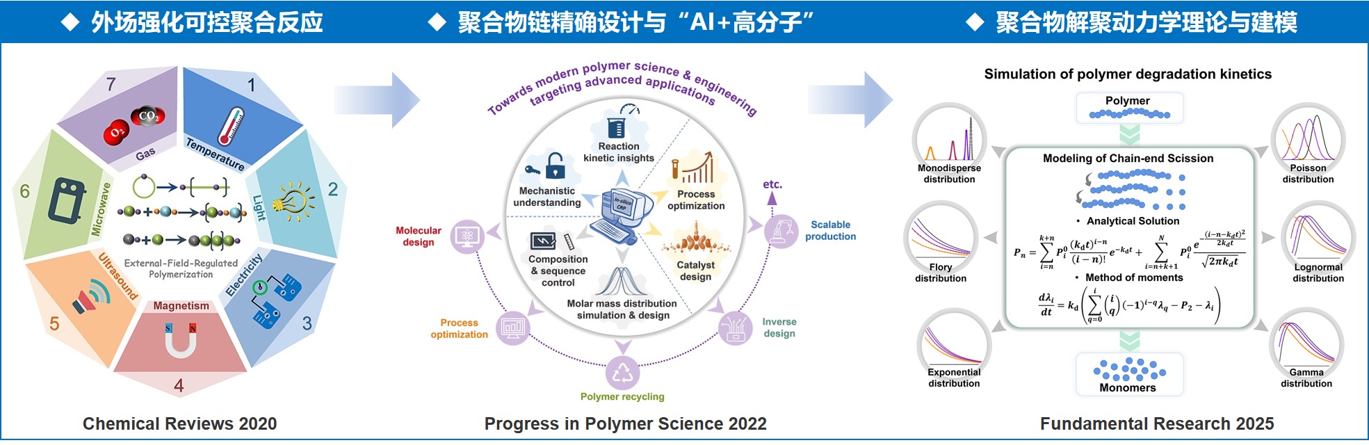 基于计算机辅助的策略,认识与调控聚合反应规律及其强化机制,实现聚合物链结构精确定制与聚合物性能预测,指导高性能聚合物的可控与智能制造。
